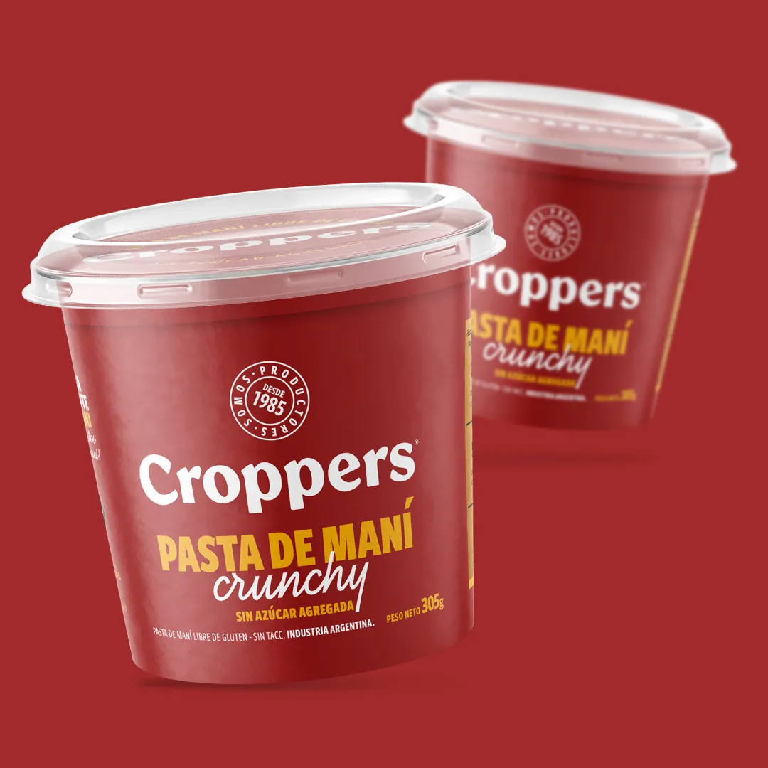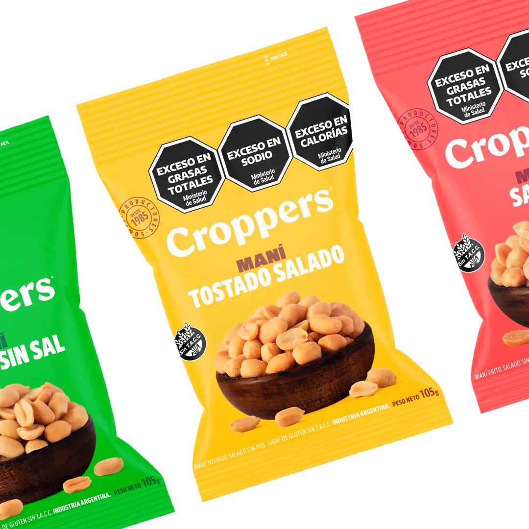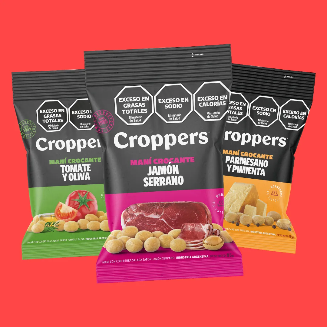 Como parte de un plan estratégico de reposicionamiento, desarrollamos junto estudio Mediato la nueva identidad para los packaging de Croppers. Implementamos una paleta cromática vibrante y una tipografía moderna para destacar su familia de productos. Utilizamos un criterio fotográfico amigable y jovial para reforzar la imagen de marca líder y atractiva.